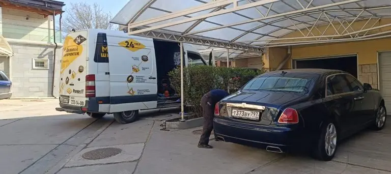 Оборудование мобильное, ничего не мешает работать прямо внизу. Даже если пробило колесо в узком месте, технику не нужно выгонять наружу. Всё делается на месте: быстро, аккуратно и без суеты. Водителю остаётся только открыть доступ к машине.